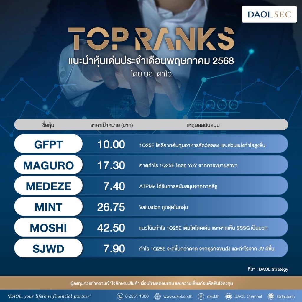 HoonSmart.com>>บล.ดาโอ ส่องทิศทางหุ้นเดือนพ.ค. ติดตาม 4 ปัจจัย “ไทยเจรจาการค้ากับสหรัฐฯ-เกาะติดสหรัฐฯ-จีน-กำไรบจ.ไทย/Q168-ประชุมเฟด” พร้อมคาดการณ์กำไรบจ. Q1/68 ราว 2.05 แสนล้านบาท ลดลง 23% YoY แต่ฟื้นตัว 16% จาก Q4/67 แนะกลยุทธ์หาจังหวะเข้าซื้อ”Selective Buy” เน้นหุ้นราคาลงมาลึก-หุ้นปันผลสูง คัด 6 หุ้นเด่นแนะนำ GFPT, MAGURO, MEDEZE, MINT, MOSHI, SJWD