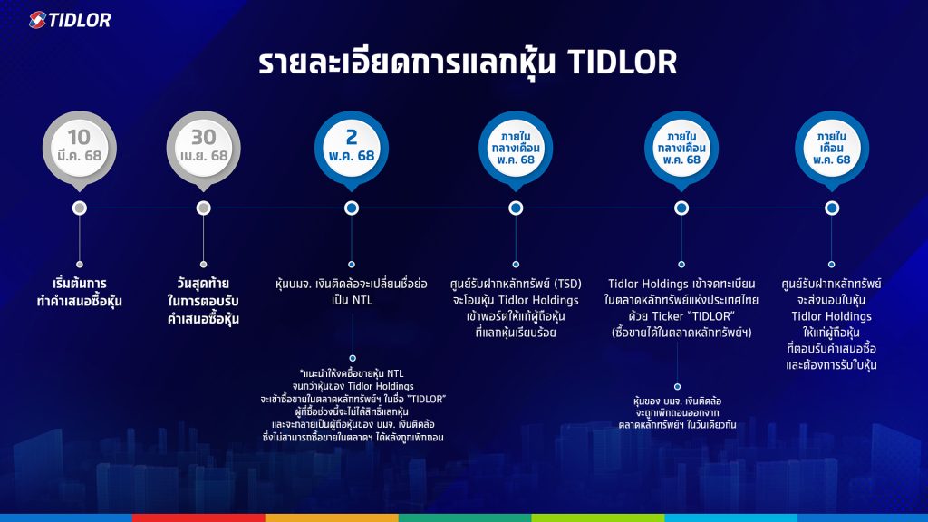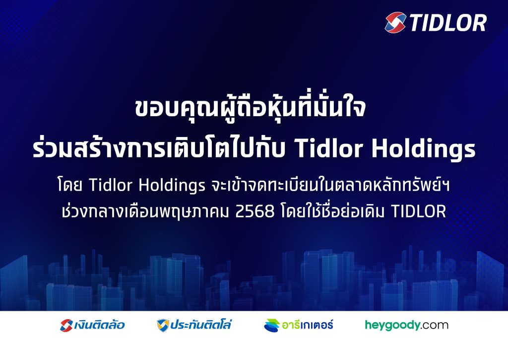 ทั้งนี้ Tidlor Holdings จะเข้าจดทะเบียนในตลาดหลักทรัพย์ฯ ช่วงกลางเดือนพฤษภาคม 2568 โดยใช้ชื่อย่อเดิม TIDLOR สำหรับผู้ถือหุ้นและนักลงทุนสามารถเยี่ยมชมข้อมูลเพิ่มเติมได้ที่เว็บไซต์ www.tidlorinvestor.com