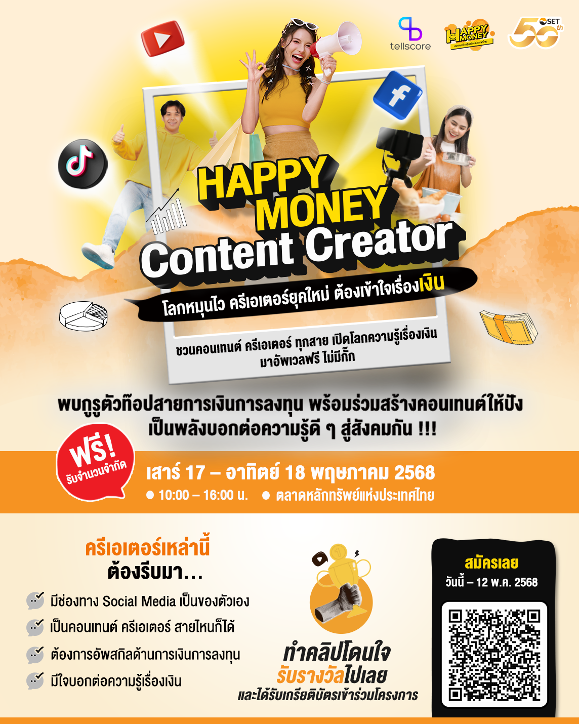 ตลาดหลักทรัพย์ฯ ร่วมกับ Tellscore ชวน Content Creator ทุกสาย มาอัปสกิลเรื่องการเงินกับโครงการ “Happy Money Content Creator” เรียนรู้การจัดการเรื่องการเงินการลงทุนให้เหมาะกับไลฟ์สไตล์ของตัวเองและเป็นพลังในการส่งต่อความรู้สู่สังคม โดยเปิดพื้นที่สร้างสรรค์คอนเทนต์ มีรางวัลพิเศษสำหรับ Content Creator ที่ทำคลิปโดนใจ พร้อมพบกิจกรรมเรียนรู้แบบจัดเต็มตลอด 2 วันกับผู้เชี่ยวชาญและกูรูตัวท๊อปสายการเงินการลงทุน ในวันเสาร์ที่ 17 และอาทิตย์ที่ 18 พ.ค. 2568 ณ อาคารตลาดหลักทรัพย์ฯ มีหัวข้อน่าสนใจ อาทิ