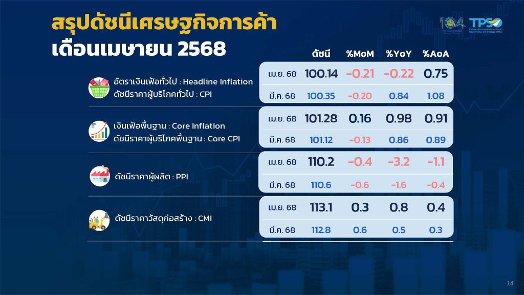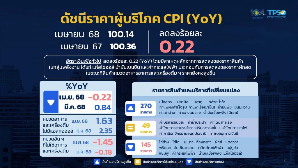 นายพูนพงษ์ นัยนาภากรณ์ ผู้อำนวยการสำนักงานนโยบายและยุทธศาสตร์การค้า (สนค.) โฆษกกระทรวงพาณิชย์ เผยว่า ดัชนีราคาผู้บริโภคทั่วไปของไทย เดือนเมษายน 2568 เท่ากับ 100.14 เมื่อเทียบกับเดือนเมษายน 2567 ซึ่งเท่ากับ 100.36 ทำให้อัตราเงินเฟ้อทั่วไปลดลงร้อยละ 0.22 (YoY) โดยปัจจัยหลักมาจากการลดลงของราคาสินค้าในกลุ่มพลังงาน ได้แก่ แก๊สโซฮอล์ น้ำมันเบนซิน และค่ากระแสไฟฟ้า ตามสถานการณ์ราคาน้ำมันในตลาดโลก และมาตรการช่วยเหลือลดภาระค่าครองชีพของภาครัฐ ประกอบกับมีการลดลงของราคาผักสด และไข่ไก่ เนื่องจากสภาพอากาศที่ร้อนน้อยกว่าปีก่อน ขณะที่ราคาสินค้าอาหารบางชนิดปรับตัวสูงขึ้น อาทิ เนื้อสุกร อาหารสำเร็จรูป และเครื่องประกอบอาหาร สำหรับราคาสินค้าและบริการอื่น ๆ ส่งผลกระทบต่อภาวะเงินเฟ้อไม่มากนัก