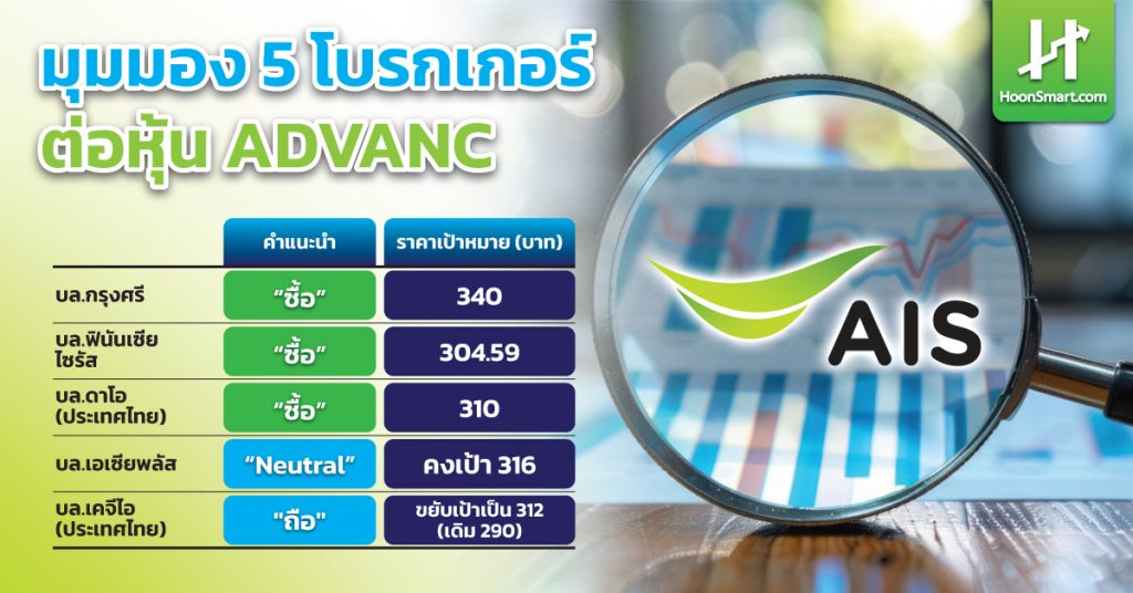 HoonSmart.com>> 5 โบรกเกอร์เชียร์ ADVANC แนวโน้มกำไรไตรมาส 2/68 โตแข็งแกร่งต่อเนื่องจากไตรมาสแรกที่มีกำไรทะลุกว่า 1 หมื่นล้านบาท จาก ARPU ขึ้น-คุมต้นทุน พร้อมเล็งอัพไซด์จากประมูลคลื่นความถี่รอบใหม่คาดว่าจะไม่แพงเท่าในอดีต และรัฐแจกเงิน 10,000 บาท เฟส 3 แก่ผู้มีอายุ 16–20 ปี หนุนยอดขายอุปกรณ์มือถือ พร้อมให้เป้าสูงถึง 340 บาท ล่าสุดหุ้น ADVANC ปิดเช้าบวก 2.36% อยู่ที่ 304 บาท