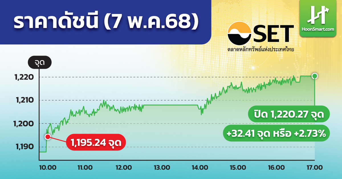 ตลาดหลักทรัพย์วันที่ 7 พ.ค.68 ดัชนีปิดสูงสุดของวันที่ระดับ 1,220.27 จุด เพิ่มขึ้น 32.41 จุด หรือ +2.73% มูลค่าซื้อขาย 53,984.70 ล้านบาท ดัชนีแตะสูงสุด 1,220.27 จุด ต่ำสุด 1,195.24 จุด