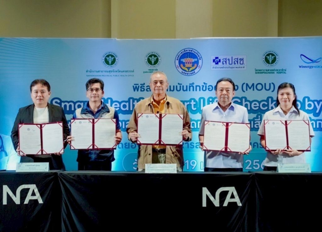 นายธนกร วิทยะสิรินันท์ (ที่ 1 จากซ้าย) กรรมการ บริษัท วินเนอร์ยี่ เมดิคอล (WINMED), พล.ต.อ.สมศักดิ์ จันทะพิงค์ (กลาง) นายกองค์การบริหารส่วนจังหวัดนครสวรรค์ และนายแพทย์จักราวุธ จุฑาสงฆ์ (ที่ 2 จากขวา) นายแพทย์สาธารณสุขจังหวัดนครสวรรค์ ร่วมลงนามบันทึกข้อตกลงรณรงค์การตรวจคัดกรองมะเร็งปากมดลูก เพื่อยกระดับระบบสุขภาพปฐมภูมิ รณรงค์ให้ประชาชนในจังหวัดนครสวรรค์ได้รับการตรวจคัดกรองสุขภาพเบื้องต้น และให้กลุ่มสตรีที่มีอายุตั้งแต่อายุ 30-60 ปี เข้าถึงการตรวจคัดกรองมะเร็งปากมดลูก ลดอัตราการเสียชีวิตจากโรคมะเร็งปากมดลูก