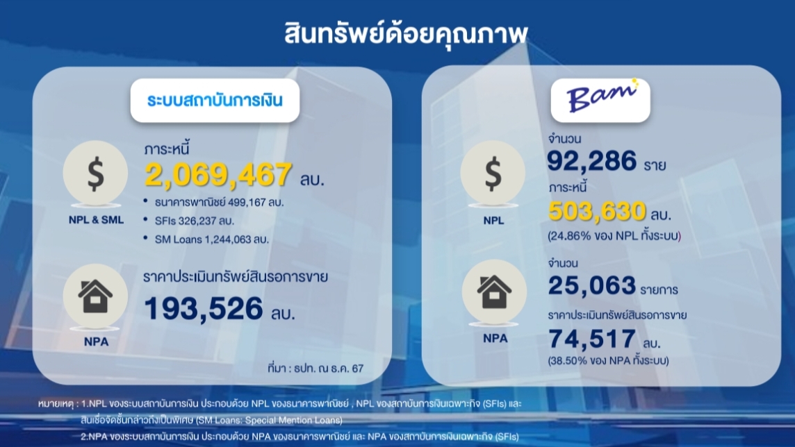 ขณะที่ BAM มี NPA ในความดูแล ณ สิ้นปี 2567 จำนวน 503,603 ล้านบาท หรือคิดเป็น 24.86% ของระบบสถาบันเงิน รวมทั้งมี NPA จำนวน 74.517 ล้านบาท หรือคิดเป็น 38.50% ของระบบสถาบันการเงิน