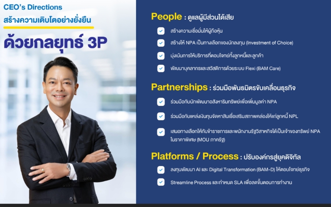 ชะลอตัวและภาวะการแข่งขันสูง โดยมีเป้าหมายยกระดับให้ BAM ก้าวสู่ Next Chapter ที่เป็นมากกว่า AMC สู่ Business Recycling Machine ช่วยพลิกฟื้นลูกหนี้เดินหน้าต่อไปได้อย่างยั่งยืน สร้างการเติบโตของกำไรอย่างมีเสถียรภาพ