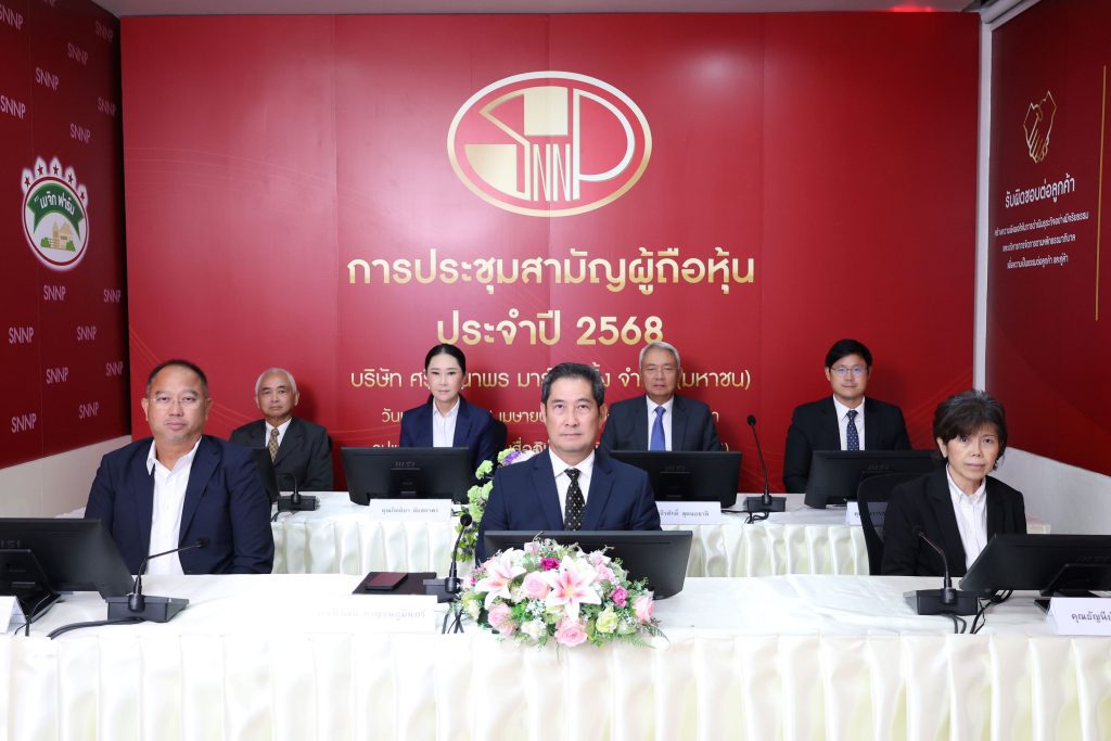 นายนิวัฒน์ กาญจนภูมินทร์ (กลาง แถวหน้า) ประธานกรรมการบริษัท นางธัญนีย์ ไกรพิสิทธิ์กุล (ที่ 1 จากขวา แถวหน้า) ประธานกรรมการบริหาร และนายฐากร ชัยสถาพร (ที่ 1 จากซ้าย แถวหน้า) ประธานเจ้าหน้าที่บริหาร พร้อมด้วยคณะกรรมการและผู้บริหาร บริษัท ศรีนานาพร มาร์เก็ตติ้ง (SNNP) ถ่ายภาพร่วมกันหลังการประชุมสามัญผู้ถือหุ้นประจำปี 2568 ในรูปแบบออนไลน์ จัดขึ้น ณ ห้องประชุมใหญ่บริษัท ถนนพุทธมณฑลสาย 5 ตำบลกระทุ่มล้ม อำเภอกระทุ่มแบน จังหวัดสมุทรสาคร เมื่อเร็ว ๆ นี้