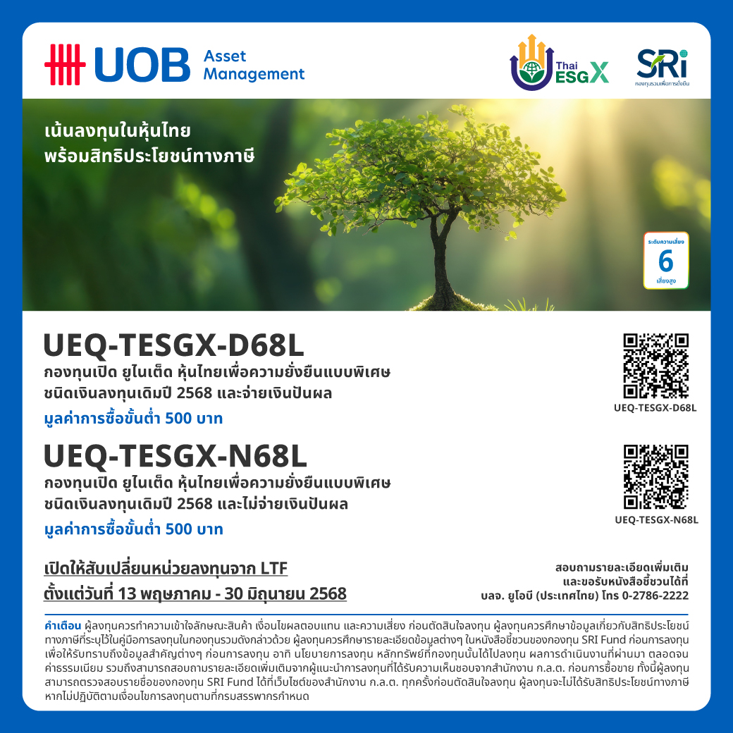 กองทุนเปิด ยูไนเต็ด หุ้นไทยเพื่อความยั่งยืนแบบพิเศษ ชนิดเงินลงทุนเดิมปี 2568 และไม่จ่ายเงินปันผล (UEQ-TESGX-N68L): https://www.uobam.co.th/th/mutual-fund/00872/UEQ-TESGX-N68L