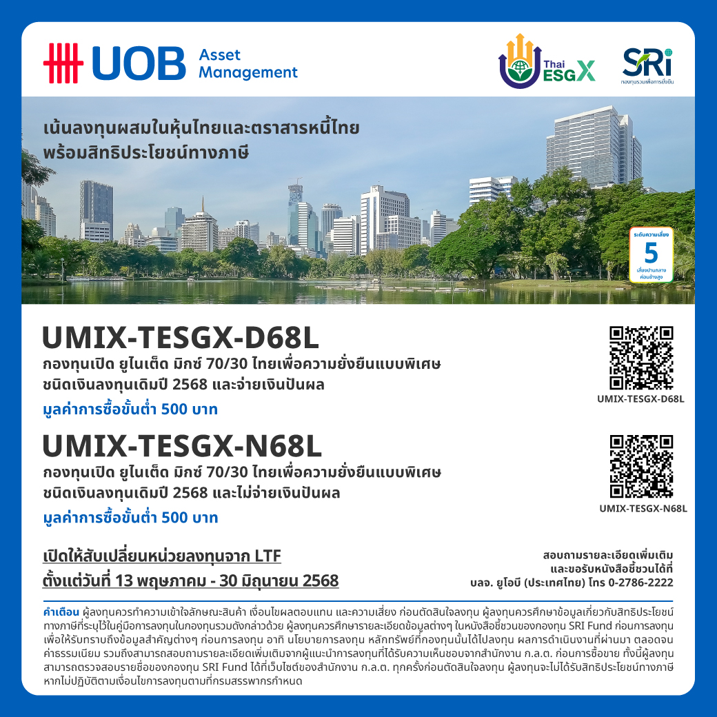 กองทุนเปิด ยูไนเต็ด มิกซ์ 70/30 ไทยเพื่อความยั่งยืนแบบพิเศษ ชนิดเงินลงทุนเดิมปี 2568 และไม่จ่ายเงินปันผล (UMIX-TESGX-N68L): https://www.uobam.co.th/th/mutual-fund/00874/UMIX-TESGX-N68L