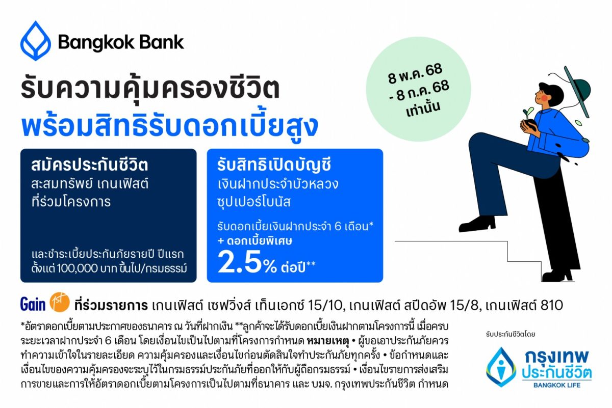 สำหรับผู้สนใจสมัครเข้าร่วมโครงการพิเศษ ‘Gain & Save รับความคุ้มครองชีวิตพร้อมรับสิทธิ์ดอกเบี้ยพิเศษ’ ได้ที่ธนาคารกรุงเทพทุกสาขาทั่วประเทศ