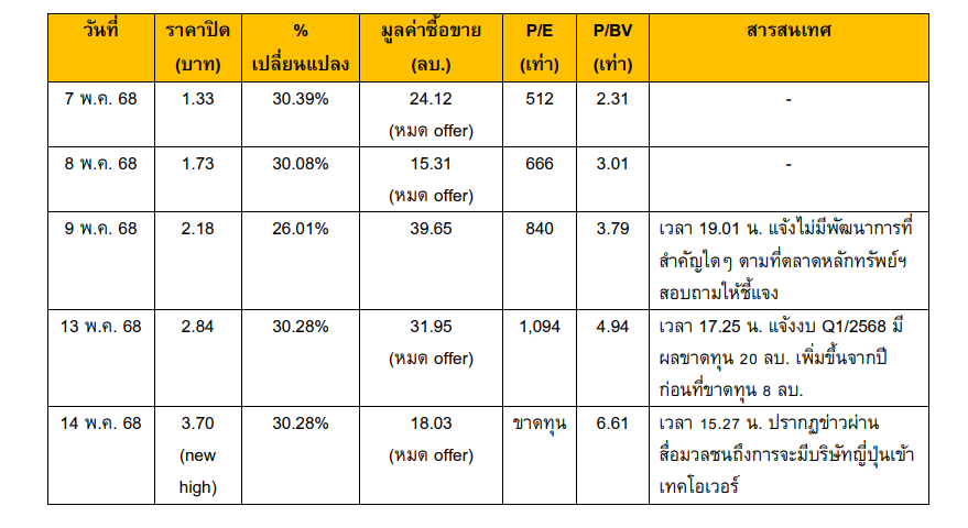 จากนั้นช่วงบ่ายมีแรงขายออกมา ส่งผลให้ราคาหุ้นสวิงรุงแรง จากที่ซิลลิ่ง 30% ลงไปหวิดฟอร์ล ลงไปต่ำสุดของวันที่ 2.64 บาท ก่อนเด้งมาปิด 2.78 บาท ลดลง 0.92 บาท หรือ 24.86% ปริมาณหุ้นซื้อขาย 25.35 ล้านหุ้น มูลค่าซื้อขาย 97.59 ล้านบาท