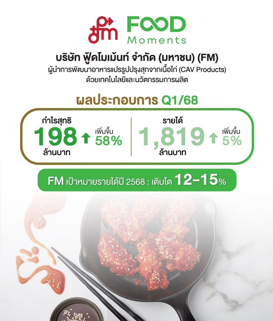 นายณัฐพล ดุษฎีโหนด ประธานเจ้าหน้าที่บริหาร บริษัท ฟู้ดโมเม้นท์ (FM) ผู้นำการพัฒนาอาหารแปรรูปปรุงสุกจากเนื้อไก่ (CAV Products) ด้วยเทคโนโลยีและนวัตกรรมการผลิต เปิดเผยว่า บริษัทฯ ยังคงเน้นสร้างการเติบโตอย่างมั่นคงและมีเสถียรภาพ เพื่อสร้างผลตอบแทนที่ดีให้กับผู้ถือหุ้น โดยมุ่งเน้นการสร้างมูลค่าเพิ่มของผลิตภัณฑ์ไก่แปรรูปปรุงสุก (CAV Products) ซึ่งเป็นสินค้าไฮมาร์จิ้นและมีโอกาสการเติบโตสูง รวมทั้งการขยายกำลังการผลิต การเพิ่มไลน์การผลิตใหม่ของโรงงานแปรรูปไก่ปรุงสุก โรงเชือดและชำแหละไก่ รองรับปริมาณการขายเพิ่มขึ้นทั้งในและต่างประเทศ