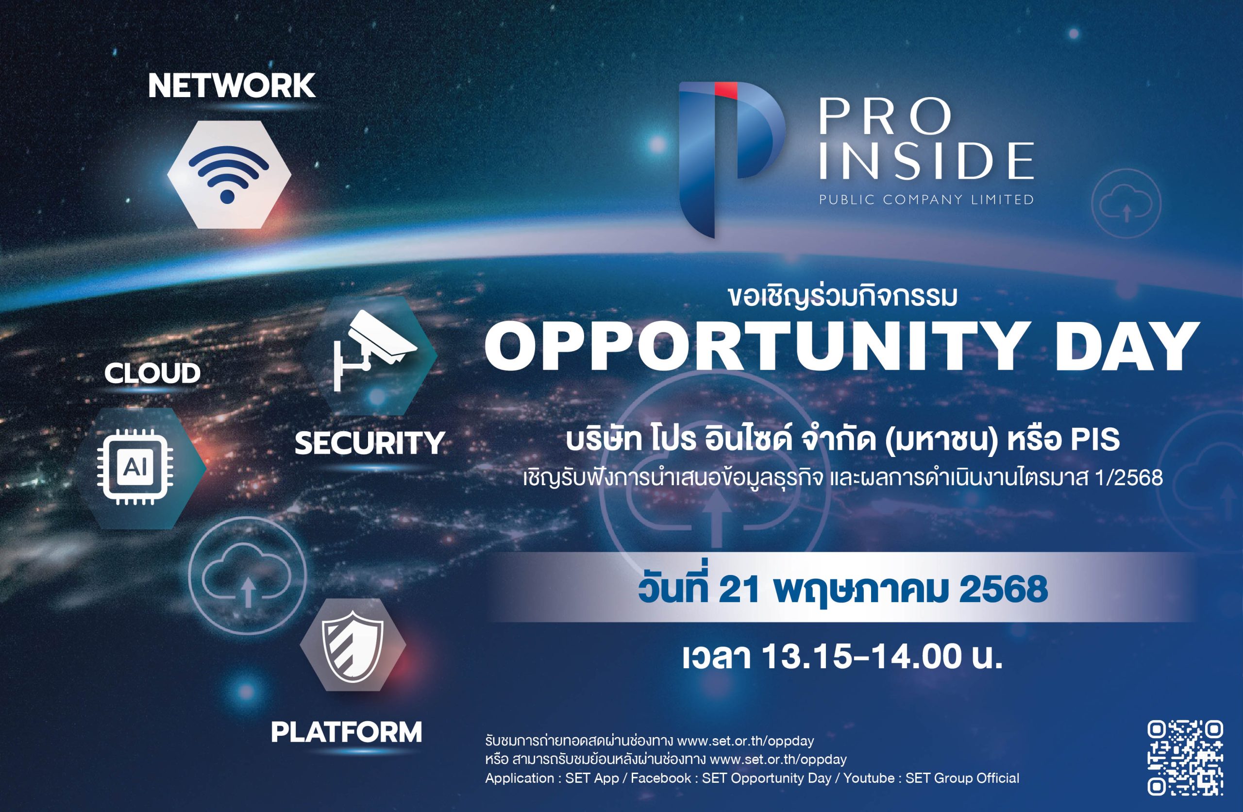 วันที่ 21 พ.ค. เวลา 13.15 -14.00 น. รับฟังข้อมูลผ่านช่องทาง www.set.or.th/oppday หรือรับชมการถ่ายทอดสดทาง Facebook : SET Opportunity Day และ YouTube: SET Thailand …เตรียมกดแจ้งเตือนรอรับฟังข้อมูลเด็ดจาก PIS กันนะคร้าาา!!
