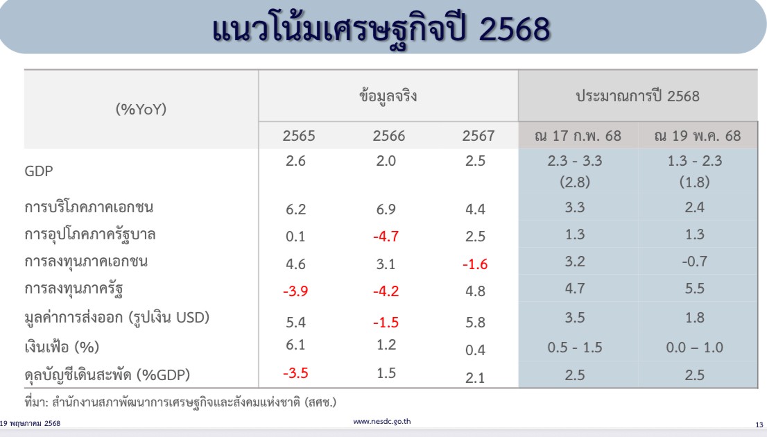 อย่างไรก็ดี การขยายตัวของเศรษฐกิจไทยทั้งปียังมีข้อจำกัดจากภาระหนี้สินครัวเรือนและภาคธุรกิจที่อยู่ในระดับสูง และมีแนวโน้มชะลอตัวลงในช่วงครึ่งหลังของปี 2568 ตามแนวโน้มการชะลอตัวของเศรษฐกิจและปริมาณการค้าโลก และผลกระทบจากการดำเนินมาตรการทางการค้าของสหรัฐฯ รวมทั้งความเสี่ยงจากความผันผวนในภาคเกษตร ทั้งนี้ คาดว่าการอุปโภคบริโภคจะขยายตัว 2.4% และการลงทุนภาคเอกชนลดลง 0.7% ขณะที่มูลค่าการส่งออกในรูปดอลลาร์สหรัฐฯขยายตัว 1.8% อัตราเงินเฟ้อเฉลี่ยอยู่ในช่วง 0.0-1.0% และดุลบัญชีเดินสะพัดเกินดุล 2.5% ของ GDP