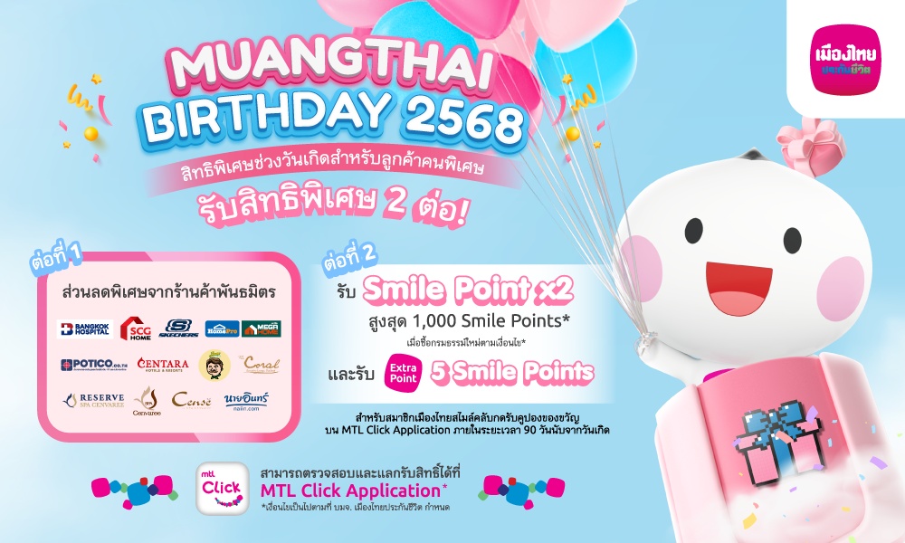 นายสาระ ล่ำซำ ประธานเจ้าหน้าที่บริหาร บริษัท เมืองไทยประกันชีวิต ( MTL) เปิดเผยว่า บริษัทฯส่งมอบความสุขเนื่องในโอกาสวันคล้ายวันเกิดแก่สมาชิกเมืองไทยสไมล์คลับ ประจำปี 2568 รับฟรีคะแนนสะสม 5 Smile Points สำหรับใช้แลกรับสิทธิพิเศษและบริการจากเมืองไทยสไมล์คลับ พร้อมรับคะแนนสะสมเพิ่มพิเศษ 2 เท่า เมื่อซื้อ