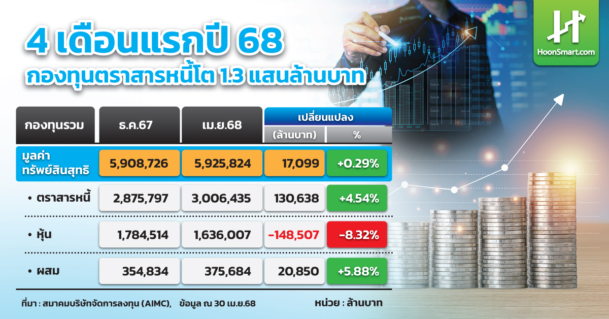 HoonSmart.co>> กองทุนรวม 4 เดือนแรกแผ่วโต 1.7 หมื่นล้านบาท เพิ่มขึ้น 0.29% มูลค่าแตะ 5.92 ล้านล้านบาท เงินโยกเข้ามันนี่มาร์เก็ต กองทุนตราสารหนี้ดันยอดโต 1.3 แสนล้านบาท เพิ่มขึ้น 4.54% พักเงินลงทุน หลบความเสี่ยงตลาดหุ้นร่วง รอความชัดเจนภาษีสหรัฐฯ ด้านเศรษฐกิจในประเทศชะลอตัว ส่วนกองทุน LTF แรงขายชะงักหลังรัฐเปิดทางโอนเข้า Thai ESGX ด้าน “บลจ.บัวหลวง” ประเมินอุตสาหกรรมปีนี้ยังเติบโตได้ดีจากกองทุนตราสารหนี้ เตรียมออกกองทุนตราสารหนี้ระยะสั้นอายุไม่เกิน 1 ปี เสิร์ฟลูกค้าแบงก์