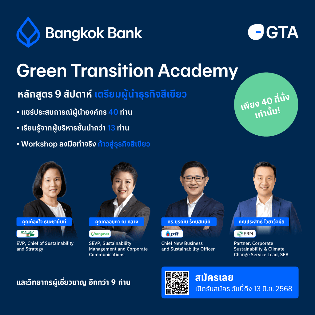 สำหรับผู้นำองค์กรธุรกิจที่สนใจเข้าร่วมอบรมหลักสูตร “Green Transition Academy รุ่นที่ 1” สามารถสมัครได้แล้วตั้งแต่วันนี้-13 มิถุนายน 2568 (จำนวนจำกัด 40 ท่าน) การอบรมจะจัดสัปดาห์ละ 1 วัน ตั้งแต่ 26 มิถุนายน – 5 กันยายน 2568 รวมทั้งหมด 9 สัปดาห์ ศึกษารายละเอียดเพิ่มเติมได้ที่เว็บไซต์ www.bangkokbank.com [Link: https://www.bangkokbank.com/th-TH/About-Us/Sustainability/The-Great-Green-Transition ] หรือสอบถามเพิ่มเติมได้ที่ คุณพิชญานิน วาดประพันธ์ โทร 0-2353-5539 หรือ คุณปุณยาพร ชวาลารัตน์ โทร 0-2626-3991