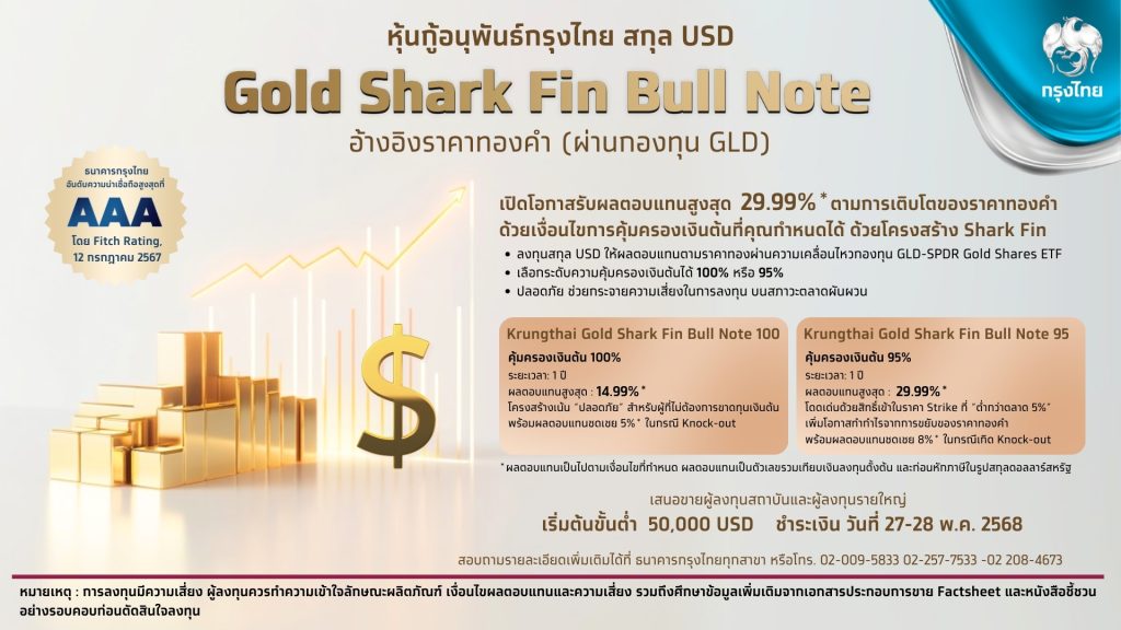 HoonSmart.com>> ธนาคารกรุงไทย (KTB) เปิดตัว “หุ้นกู้อนุพันธ์ Krungthai Gold Shark Fin” อายุ 1 ปี สกุลเงินดอลลาร์สหรัฐฯ สร้างโอกาสรับผลตอบแทนอ้างอิงราคาทองคำสูงสุด 29.99% พร้อมทางเลือกคุ้มครองเงินต้นที่เลือกได้ ตอบโจทย์ผู้ที่มองหาโอกาสรับผลตอบแทนสูง พร้อมบริหารความเสี่ยงจากภาวะเงินเฟ้อและตลาดเงินผันผวน เปิดขายผู้ลงทุนสถาบัน-ผู้ลงทุนรายใหญ่ 27-28 พ.ค.นี้