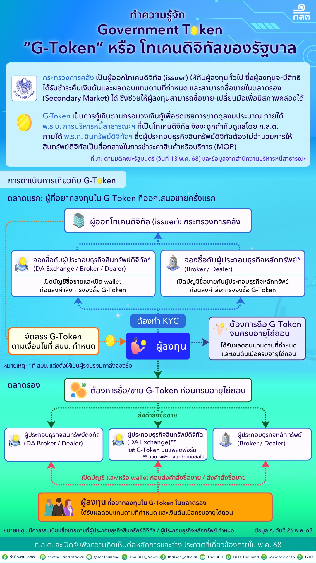 นางพรอนงค์ บุษราตระกูล เลขาธิการสำนักงานคณะกรรมการกำกับหลักทรัพฺย์และตลาดหลักทรัพย์ (ก.ล.ต.) เปิดเผยว่า ก.ล.ต.จะเปิดรับฟังความคิดเห็นต่อหลักการการกำกับดูแลโทเคนดิจิทัลของรัฐบาล (G-Token) ในวันที่ 26 พ.ค.2568 โดยใช้ระยะเวลาประมาณ 15 วัน หลังจากนั้นจะนำผลสรุปมาออกเป็นร่างประกาศ โดยมีสาระสำคัญ 4 ประเด็นคือ 1.ลักษณะการออก G-Token โดยกระทรวงการคลังกู้เงินด้วย “วิธีการอื่นใด” ตามมาตรา 10 วรรคหนึ่ง พ.ร.บ.การบริหารหนี้สาธารณะฯ โดย G-Token เป็นการกู้เงินตามกรอบวงเงินกู้เพื่อชดเชยขาดดุลงบประมาณ และกำหนดสิทธิให้ผู้ถือได้รับคืนเงินต้นและผลตอบแทนตามที่กำหนด จึงกำหนดให้ G-Token เป็นโทเคนดิจิทัลภายใต้ พ.ร.ก. สินทรัพย์ดิจิทัลฯ
