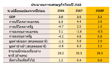 ดร.พิมพ์นารา หิรัญกสิ หัวหน้าทีมวิจัยเศรษฐกิจ และผู้บริหารสายงานวิจัย ธนาคารกรุงศรีอยุธยา กล่าวว่า วิจัยกรุงศรีคาดว่าเศรษฐกิจไทยปี 2568 จะเติบโต 2.1% ชะลอลงจากคาดการณ์เดิมที่ 2.7%