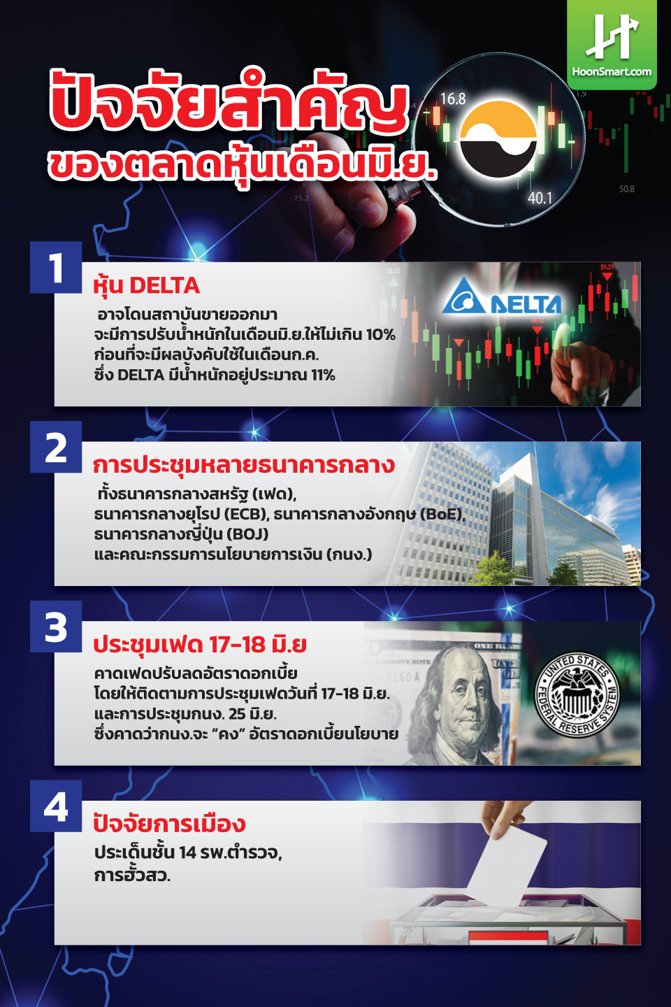 HoonSmart.com>> 4 โบรกเกอร์เห็นพ้องหุ้นไทยเดือนมิ.ย.ผันผวน เผชิญแรงกดดันจากปัจจัยการเมืองในประเทศ-นโยบายภาษีของสหรัฐฯ-เล็ง DELTA ถูกเทก่อนใช้เกณฑ์ใหม่น้ำหนัก 10% เริ่มก.ค. ท่ามกลางจับตาการประชุมหลายธนาคารกลาง ทั้งเฟด, ECB, BoE, BOJ โดยกรอบแกว่งเดือนนี้ 1,250-1,100 จุด พร้อมมองหุ้นเด่นมิ.ย. ได้แก่ MTC, PR9, TOP, PTTGC, IVL, PTT