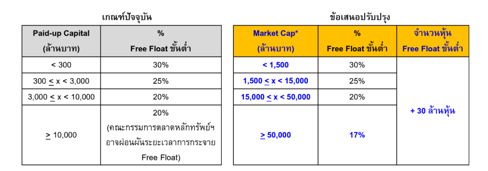 1.2 ปรับปรุงสัดส่วน Free Float จากขั้นต่ำ 20% เป็นขั้นต่ำ 17% สำหรับบริษัทขนาดใหญ่ เพื่อส่งเสริมบริษัทขนาดใหญ่เข้าจดทะเบียน ซึ่งยังคงเป็นสัดส่วน Free Float ที่สูงกว่าเกณฑ์ดำรงสถานะการเป็นบริษัทจดทะเบียนที่ขั้นต่ำ 15%