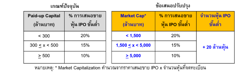 ปรับปรุงการแบ่งกลุ่มขนาดของบริษัท (Tier) ด้วยการใช้ Market Capitalization แทนการแบ่งด้วย Paid-up Capital เพื่อให้สอดคล้องกับเกณฑ์ Free Float และกำหนดจำนวนหุ้น IPO ขั้นต่ำที่ 20 ล้านหุ้น