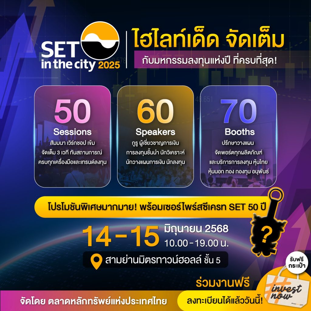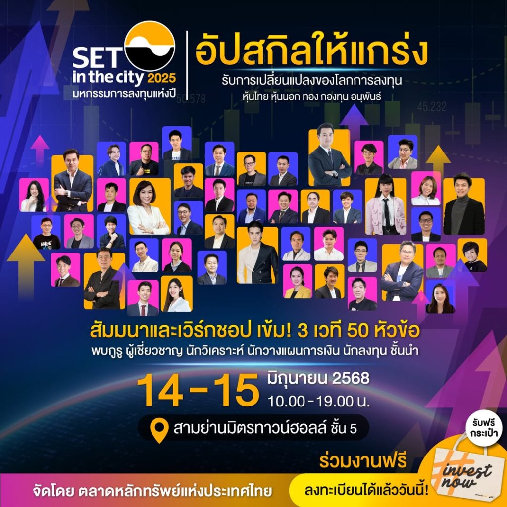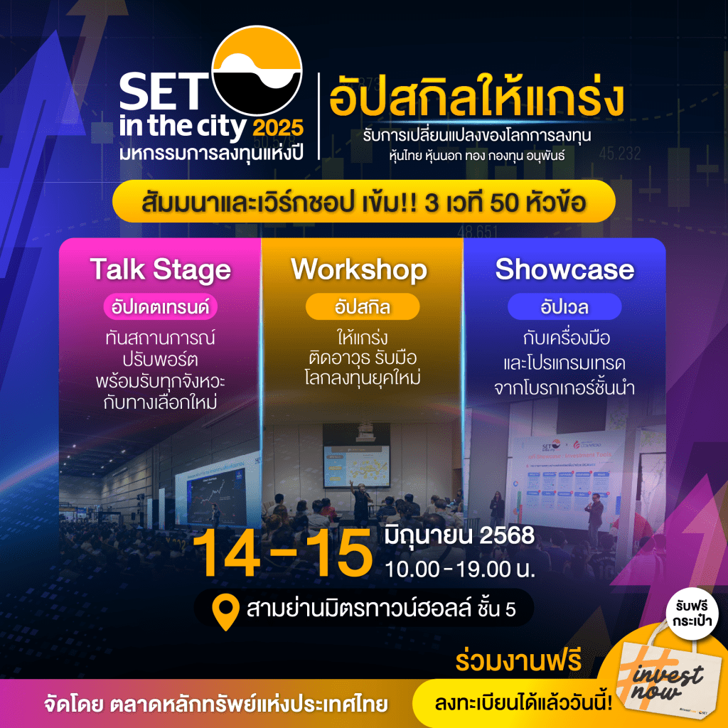 ตลาดหลักทรัพย์แห่งประเทศไทย จัดมหกรรมลงทุนการลงทุนแห่งปี SET in the City 2025 “อัปสกิลให้แกร่ง รับการเปลี่ยนแปลงของโลกการลงทุน” ชวนคุณทั้งมือใหม่และมือโปรเติมทักษะ อัปสกิลลงทุน อัปเดตสถานการณ์และเทรนด์ลงทุนพร้อมเปิดค้นหาทางเลือกใหม่เสริมในพอร์ตการลงทุน ทั้งหุ้นไทย หุ้นนอกผ่าน DR อนุพันธ์ ทอง กองทุนรวม และกองทุนลดหย่อนภาษี Thai ESG และ Thai ESGX พร้อมบริการโอนย้าย LTF ได้ในงาน