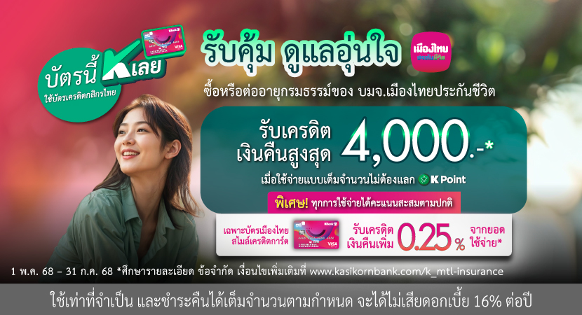 ทุกยอดใช้จ่ายได้รับ คะแนนสะสม K Point ,ผู้ถือบัตรเมืองไทยสไมล์เครดิตการ์ดรับเงินคืนเพิ่ม 0.25% จากยอดชำระเบี้ย โดยไม่จำกัดจำนวน