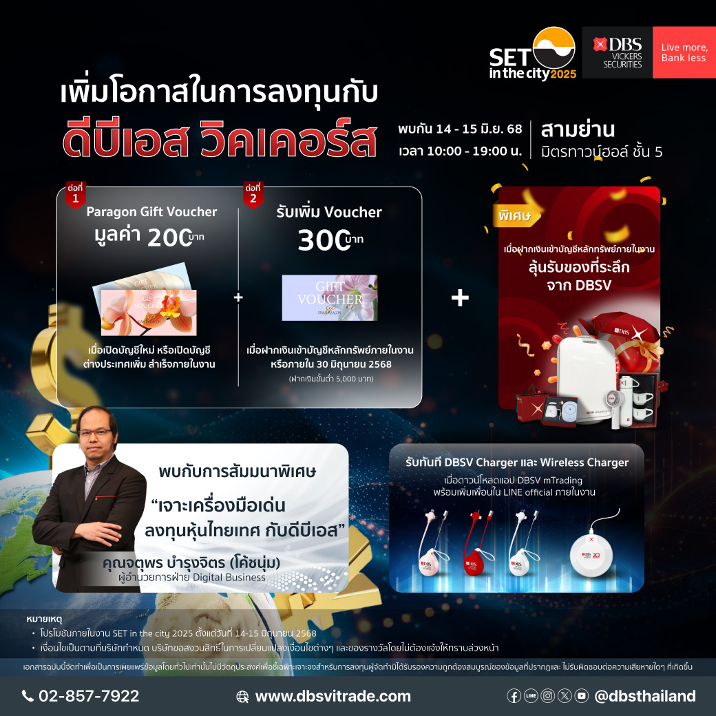 HoonSmart.com>>บล.ดีบีเอส วิคเคอร์ส ร่วมงาน มหกรรมการเงิน SET in the city 2025 พร้อมโปรโมชัน เปิดบัญชีภายในงานรับ Paragon Gift Voucher 200 บาท ลุ้นของที่ระลึกพิเศษมากมาย ตั้งแต่ 14-15 มิ.ย.68 ณ สามย่านมิตรทาวน์ ฮอลล์ ชั้น 5 เลขที่บูธ S32