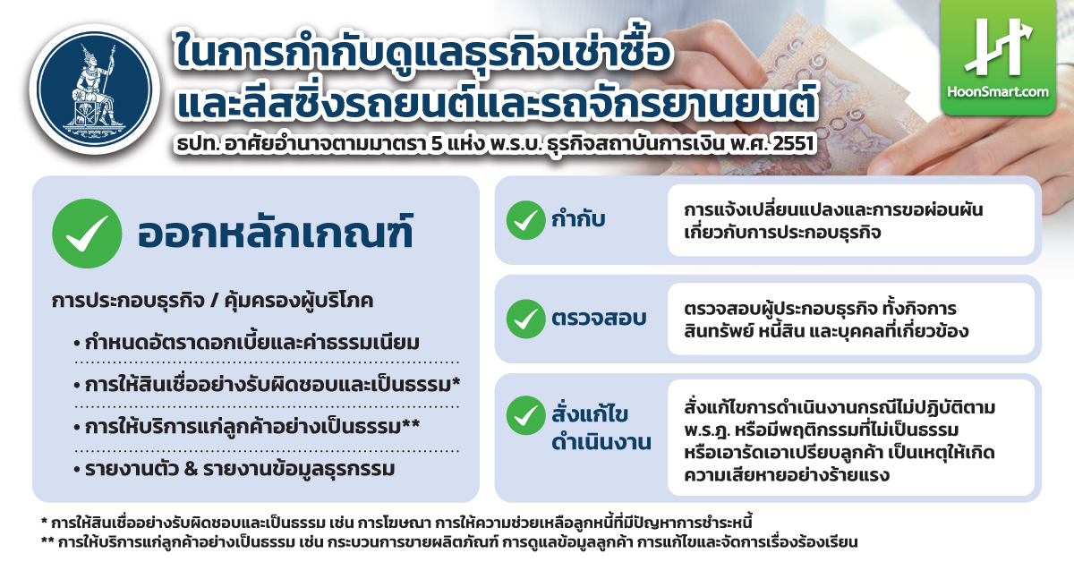 จึงมีความจำเป็นที่จะต้องให้ธุรกิจให้เช่าซื้อ ลีสซิ่ง รถยนต์และรถจักรยานยนต์ เข้ามาอยู่ในการกำกับดูแลของ ธปท. ซึ่งจะอยู่ภายใต้ พ.ร.บ.ธุรกิจสถาบันการเงิน พ.ศ. 2551 เพื่อเป็นการส่งเสริมให้ประชาชนได้รับบริการทางการเงินที่เป็นธรรม และได้รับข้อมูลที่โปร่งใส เพียงพอต่อการตัดสินใจใช้บริการ อีกทั้งเพื่อเป็นการรักษาเสถียรภาพระบบเศรษฐกิจ การเงิน และการบริหารจัดการหนี้ครัวเรือนให้อยู่ในระดับที่เหมาะสม