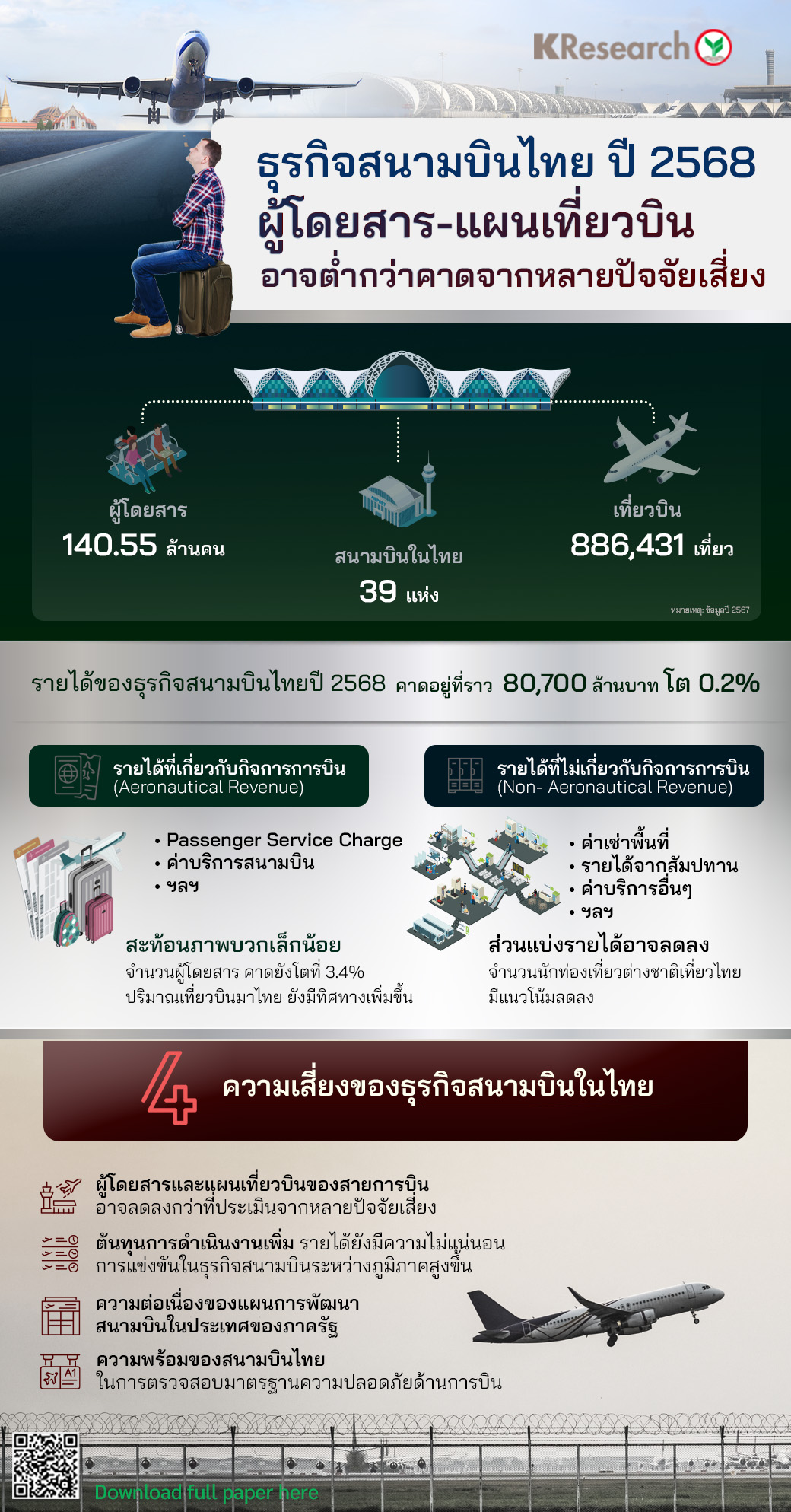ในปี 2568 ปัจจัยแวดล้อมธุรกิจสนามบินมีความท้าทายสูง ส่งผลกระทบต่อการเติบโตของรายได้ของธุรกิจสนามบินในไทยที่ชะลอตัว สำหรับปัจจัยสำคัญที่มีผลต่อรายได้ของธุรกิจสนามบิน ได้แก่
