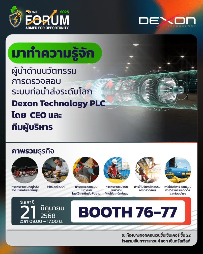 บริษัท เด็กซ์ซอน เทคโนโลยี (DEXON) เตรียมเปิดบูธแสดงนวัตกรรมและศักยภาพด้านเทคโนโลยีการตรวจสอบโครงสร้างขั้นสูงในงาน mai FORUM 2025: มหกรรมรวมพลังคน mai ครั้งที่ 9 ภายใต้แนวคิด “ARMEDFOR OPPORTUNITY – ติดอาวุธ คว้าโอกาส ในตลาด mai” วันเสาร์ที่ 21มิถุนายน 2568 เวลา 09:00–17:00 น. ณ.ชั้น 22 โรงแรมเซ็นทาราแกรนด์ แอทเซ็นทรัลเวิลด์