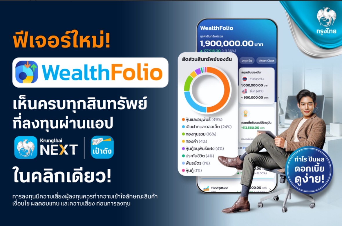 ธนาคารกรุงไทย (KTB) เดินหน้ายกระดับประสบการณ์ด้านการลงทุนให้กับผู้ใช้งานยุคใหม่ เปิดตัว “WealthFolio” ฟีเจอร์ใหม่บนแอปพลิเคชัน Krungthai NEXT และ เป๋าตัง ภายใต้บริการ NEXT Invest ชูจุดแข็งแสดงผลตอบแทนจริง ช่วยให้ผู้ใช้งานบริหารจัดการสินทรัพย์และวางแผนทางการเงินได้อย่างรอบด้าน สามารถดูข้อมูลรวมทุกสินทรัพย์การลงทุน พร้อมเปิดมิติใหม่ของการใช้งาน Consolidated Investment Statement ที่แสดงผลตอบแทนที่ได้รับจริง (Realized Return) ได้อย่างครบถ้วนในที่เดียว