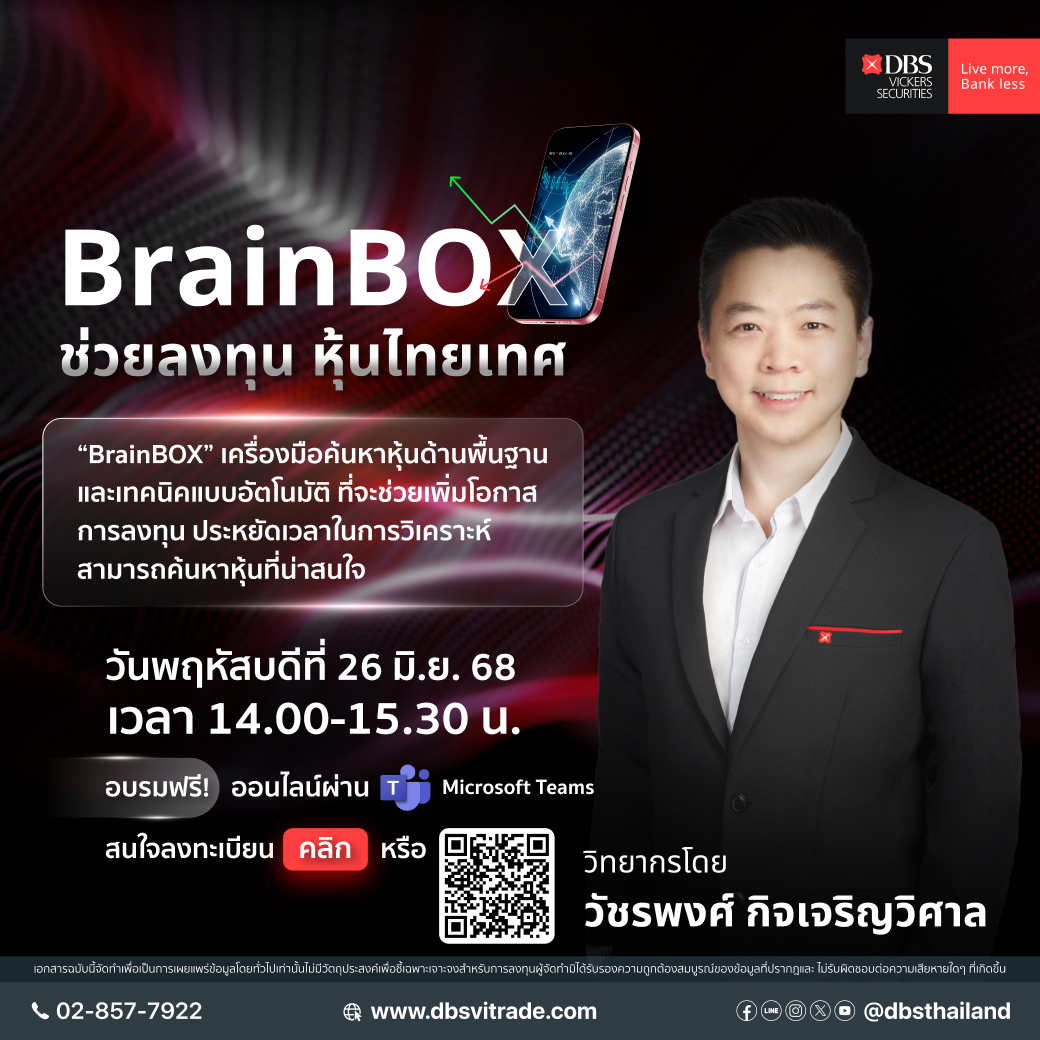 บริษัทหลักทรัพย์ ดีบีเอส วิคเคอร์ส จัดสัมมนาออนไลน์ “BrainBOX ช่วยลงทุน หุ้นไทยเทศ” ซึ่ง “BrainBOX” เครื่องมือค้นหาหุ้นด้านพื้นฐาน และเทคนิคแบบอัตโนมัติ ที่จะช่วยเพิ่มโอกาสการลงทุนประหยัดเวลาในการวิเคราะห์ สามารถค้นหาหุ้นที่น่าสนใจ โดยมี วัชรพงศ์ กิจเจริญวิศาล ผู้อำนวยการ ฝ่าย Digital Business เป็นวิทยากร ในวันที่ 26 มิ.ย.2568 เวลา 14.00 – 15.30 น. ช่องทางอบรมผ่านทาง MS Team