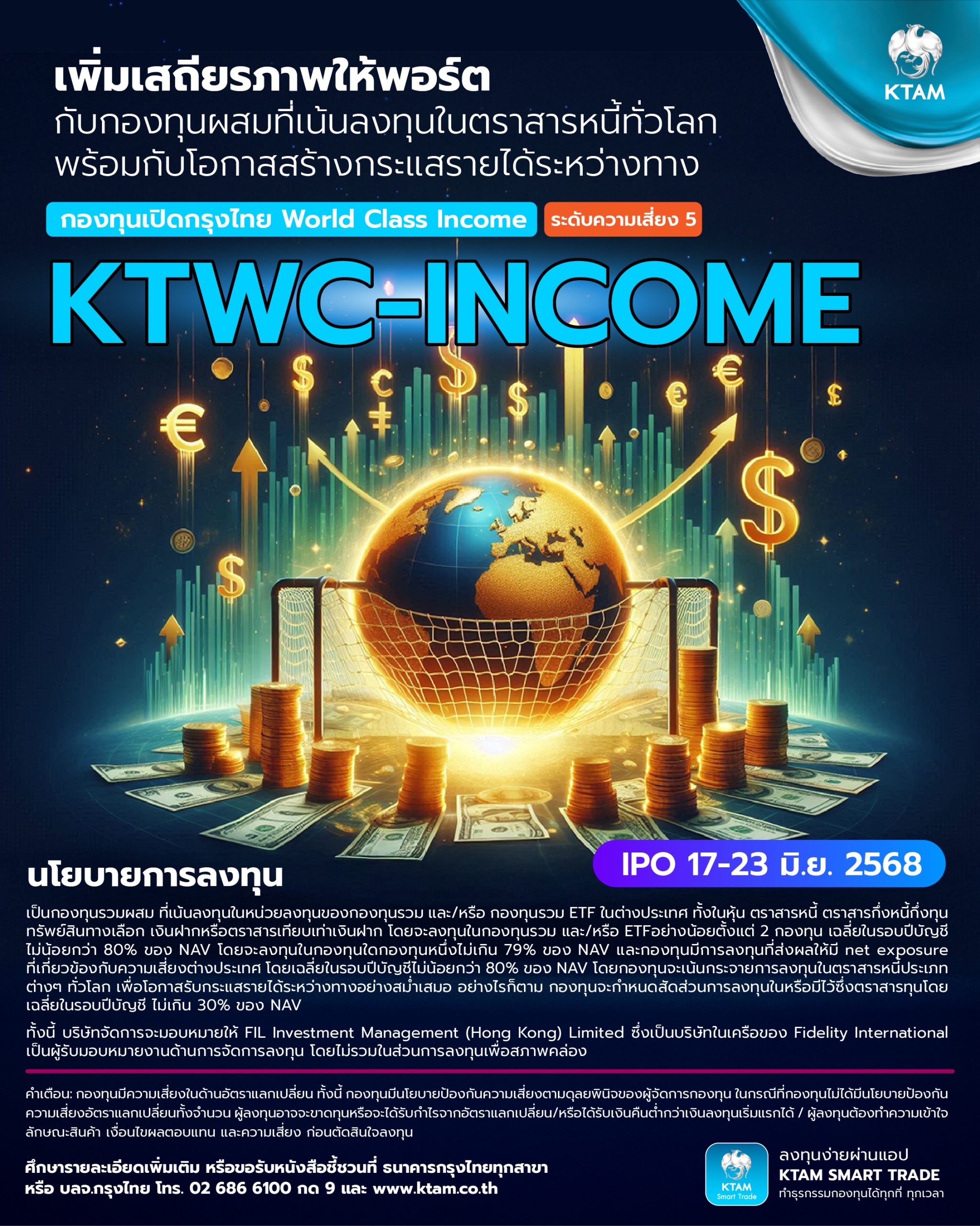 นางชวินดา หาญรัตนกูล กรรมการผู้จัดการ บริษัทหลักทรัพย์จัดการกองทุน กรุงไทย (KTAM) เปิดเผยว่า บริษัทฯ มองเห็นจังหวะโอกาสการสร้างผลตอบแทนจากตราสารหนี้ทั่วโลก พร้อมกับโอกาสการสร้างกระแสรายได้ระหว่างทางให้กับนักลงทุน เพื่อช่วยชดเชยความผันผวนภายใต้สภาวะตลาดที่ไม่แน่นอน บริษัทฯ จึงได้เปิดเสนอขาย กองทุนเปิดกรุงไทย World Class Income (KTWC-INCOME) (ความเสี่ยงระดับ 5) บริหารโดยทีมผู้จัดการกองทุนจาก Fidelity International ซึ่งที่ผ่านมาได้รับเสียงตอบรับที่ดีจากกลุ่มกองทุน KTWC Series โดยจะเปิดเสนอขายครั้งแรกระหว่างวันที่ 17 – 23 มิถุนายน 2568 นี้ ซึ่งผู้ลงทุนสามารถลงทุนได้ผ่านธนาคารกรุงไทย รวมถึงแอปพลิเคชัน Next และ KTAM Smart Trade
