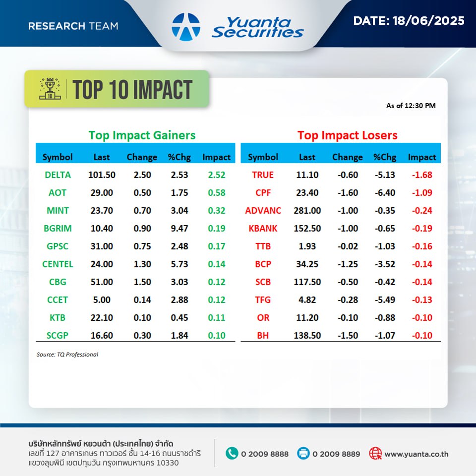 ตลาดหุ้นวันที่ 18 มิ.ย.2568 ดัชนีปิดภาคเช้าที่ระดับ 1,114.33 จุด +0.75 จุด หรือ 0.07% มูลค่าการซื้อขาย 15,297.20 ล้านบาท โดยระหว่างวันดัชนีแตะสูงสุด 1,120.33 จุดและต่ำสุด 1,110.48 จุด