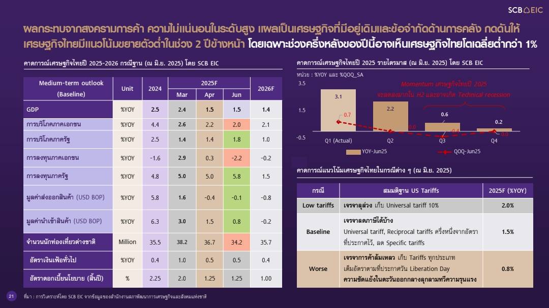ศูนย์วิจัยเศรษฐกิจและธุรกิจไทยพาณิชย์ (SCB EIC) โดย ดร.ยรรยง ไทยเจริญ ประธานเจ้าหน้าที่บริหาร สายงานวิจัยเศรษฐกิจและความยั่งยืน ,ดร.ปุณยวัจน์ ศรีสิงห์ นักเศรษฐศาสตร์อาวุโส และ น.ส.ปราณิดา ศยามานนท์ ผู้อำนวยการ ผู้บริหารฝ่าย Industry Analysis ระบุว่า เศรษฐกิจไทย(จีดีพี) ในช่วงครึ่งหลังของปี 2568 ยังคงเผชิญแรงกดดันรอบด้าน ทั้งจากสงครามการค้า ความไม่แน่นอนนโยบายทางการเงินของธนาคารกลางประเทศใหญ่ๆ ในความเร็วที่ต่างกัน และความเสี่ยงภัยด้านภูมิรัฐศาสตร์ที่สูงขึ้นจากสงครามอิหร่านและอิสราเอลปะทุขึ้น การส่งออกไทยชะลอลง ภาระหนี้ครัวเรือนสูง ความไม่แน่นอนด้านการคลังของไทย ทำให้กำลังซื้อของประชาชนลดลงการลงทุนภาคเอกชนต่ำ ก่อให้เกิดผลกระทบในวงกว้างต่อภาคธุรกิจต่าง ๆ คาดว่าจีดีพีจะโตต่ำกว่า 1% ทั้งปีคาดว่าจะโต 1.5% และมีโอกาสเข้าสู่การหดตัว (Technical Recession) ทำให้เศรษฐกิจไทยโตไม่ถึง 2% ยาวไปจนถึงปี 2569