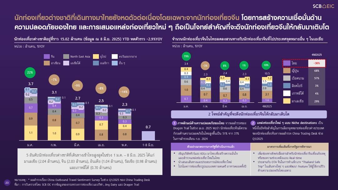 4. ภาคการท่องเที่ยว ซึ่งได้ปรับลดจำนวนนักท่องเที่ยวต่างชาติลงเหลือ 34.2 ล้านคนในปีนี้ จากปี 2567 ที่มีจำนวน 35.5 ล้านคน แม้จำนวนนักท่องเที่ยวจากตะวันออกกลางที่ใช้จ่ายต่อทริปเฉลี่ย 94,000 บาทยังมีแนวโน้มเติบโต และอินเดีย เป็นตลาดที่เติบโตเร็ว อาจช่วยพยุงอุตสาหกรรมท่องเที่ยวไทยในระยะหนึ่ง แต่ทดแทนนักท่องเที่ยวจีนหดตัวไม่ได้ จากความกังวลเรื่องความปลอดภัยเพิ่มขึ้นจาก 37% เป็น 51% ตามผลสำรวจของ Dragon Trail และขาดจุดขายใหม่ หันไปเที่ยวประเทศอื่นๆ ในเอเชียเพิ่มขึ้น