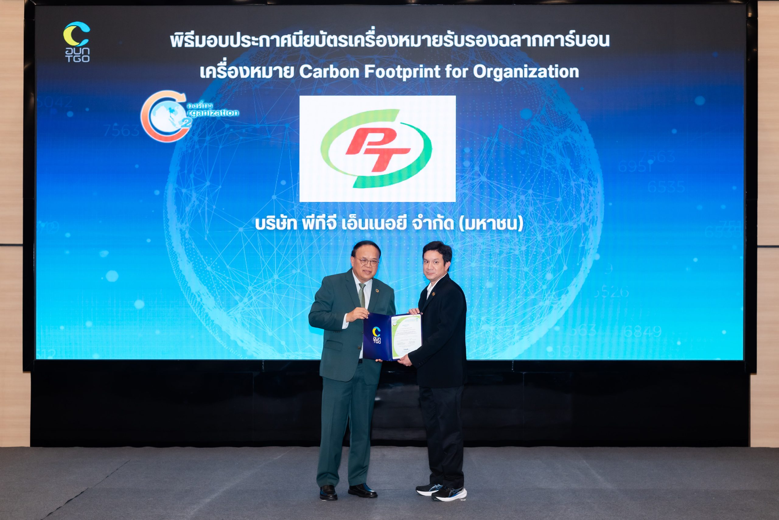 นายธีรพันธ์ ดิษบุตร (ขวา) ประธานเจ้าหน้าที่บริหาร สายงานการเงินและความยั่งยืน บริษัท พีทีจี เอ็นเนอร์ยี (PTG) รับมอบประกาศนียบัตรเครื่องหมายคาร์บอนฟุตพริ้นท์ขององค์กร (Carbon Footprint for Organization หรือ CFO) จาก ดร.วิจารย์ สิมาฉายา ประธานกรรมการองค์การบริหารจัดการก๊าซเรือนกระจก (องค์การมหาชน) เป็นผู้มอบ ตอกย้ำความมุ่งมั่นด้านความยั่งยืน