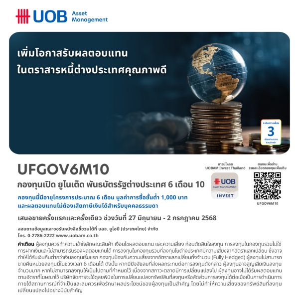 บริษัทหลักทรัพย์จัดการกองทุน (บลจ.) ยูโอบี (ประเทศไทย) จำกัด หรือ UOBAM เปิดเสนอขายหน่วยลงทุนครั้งแรก (IPO) กองทุนเปิด ยูไนเต็ด พันธบัตรรัฐต่างประเทศ 6 เดือน 10 (UFGOV6M10) เน้นลงทุนในพันธบัตรรัฐสิงคโปร์ อายุประมาณ 6 เดือน ประมาณการผลตอบแทน 1.35% ต่อปี (ข้อมูลจากอัตราผลตอบแทนที่เสนอโดยผู้ออกตราสาร หรือจากผู้ขาย ณ วันที่ 25 มิถุนายน 2568) ขนาดโครงการ 5,000 ล้านบาท โดยเสนอขายในราคา 10 บาทต่อหน่วย และยอดลงทุนขั้นต่ำ 1,000 บาท