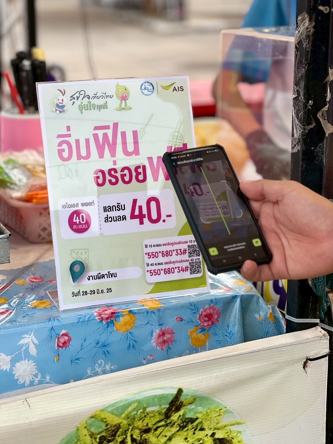 มอบสิทธิพิเศษสำหรับลูกค้า AIS เท่านั้น ผ่านแคมเปญ “อิ่มฟิน อร่อยฟรี” ให้ลูกค้าใช้ AIS Points 40 คะแนน แลกรับส่วนลดความอร่อย 40 บาท กับร้านค้าที่ร่วมรายการภายในงาน ผ่านแอป myAIS ระหว่างวันที่ 28-29 มิ.ย. นี้