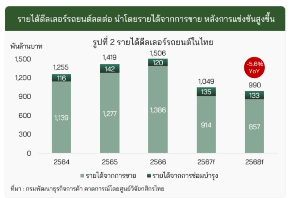 คาดว่ารายได้รวมของดีลเลอร์จะปรับลดลง 5.6% (YoY) โดยเป็นการหดตัวต่อเนื่องจากปี 2567 ที่รายได้ลดลงแรงกว่า 30.4%