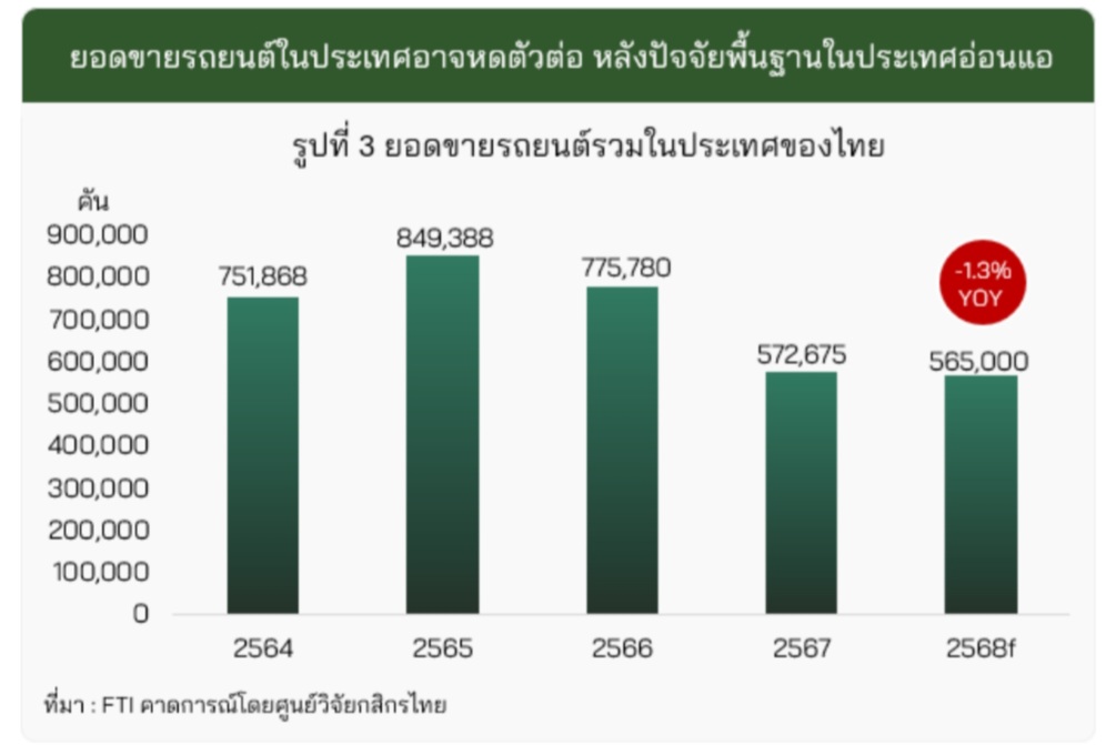 ในปี 2568 คาดว่ายอดขายรถยนต์ในประเทศจะหดตัว 1.3% (YoY) เหลือ 565,000 คัน ซึ่งลดลงจากปี 2567 ที่หดตัว 26.2% (YoY) เนื่องจากกำลังซื้ออ่อนแอจากภาวะเศรษฐกิจที่มีความเสี่ยงสูง