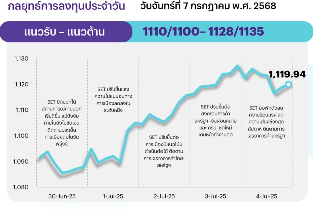สำหรับ ปัจจัยลบต่างประเทศที่กดดันตลาดวันนี้ อันดับแรก คือ ปธน.ทรัมป์ลงนามจดหมายแจ้งอัตราภาษีแก่ 12 ประเทศ โดยไทยมีแนวโน้มถูกรวมอยู่ในรายชื่อ ที่อาจถูกเก็บภาษีตั้งแต่ 10%–70% ขณะที่ไทยยังเจรจากับ USTR ไม่สำเร็จ ก่อนเส้นตายวันที่ 9 ก.ค.นี้