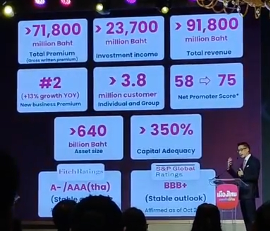 ในส่วนของเบี้ยประกันภัยรายใหม่ขยายตัว 13% เมื่อเทียบกับปีที่ผ่านมา (YoY Growth) จัดอยู่อันดับ 2 ด้านเบี้ยรายใหม่ของอุตสาหกรรม ฐานลูกค้ากว่า 3.8 ล้านราย ครอบคลุมทั้งลูกค้ารายบุคคลและลูกค้ากลุ่ม คะแนนความพึงพอใจของลูกค้ายังอยู่ในระดับสู Net Promoter Score (NPS) เพิ่มจาก 58 เป็น 75 คะแนน