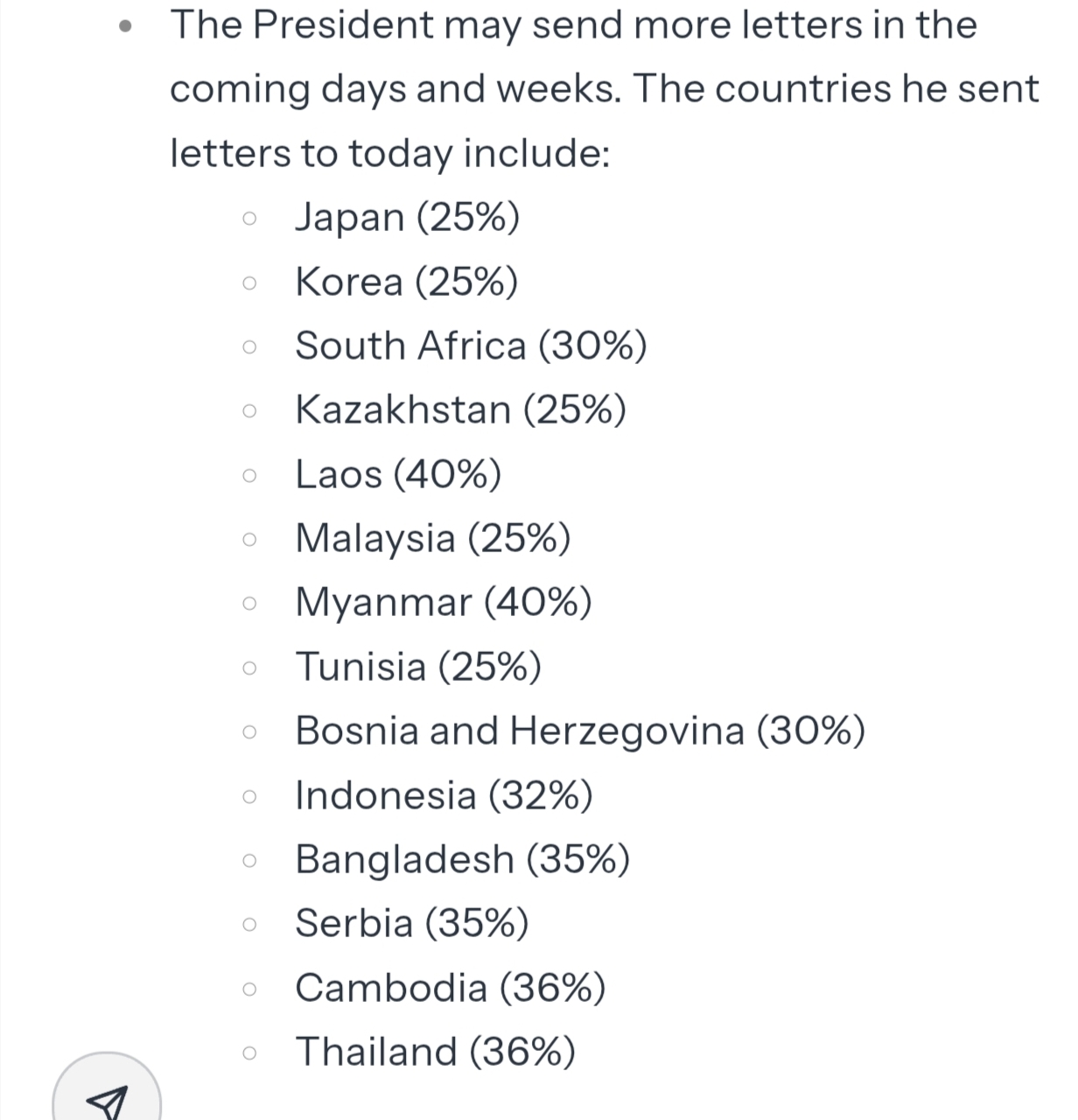 พร้อมกันนี้ เตรียมส่งจดหมายเพิ่มเติมในวันและสัปดาห์ถัดไป เพื่อแจ้งประเทศอื่น ๆ เกี่ยวกับการเปลี่ยนแปลงในอัตราภาษีใหม่