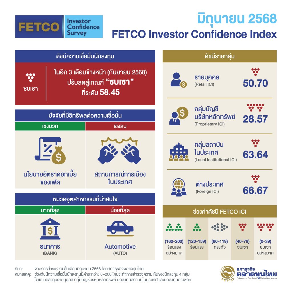 นายกอบศักดิ์ ภูตระกูล ประธานกรรมการสภาธุรกิจตลาดทุนไทย เปิดเผยดัชนีความเชื่อมั่นนักลงทุน (FETCO Investor Confidence Index) ผลสำรวจในเดือนมิถุนายน 2568 (สำรวจระหว่างวันที่ 20-30 มิถุนายน 2568) พบว่า “ดัชนีความเชื่อมั่นนักลงทุน (FETCO Investor Confidence Index: ICI) ในอีก 3 เดือนข้างหน้าปรับกลับสู่เกณฑ์ “ซบเซา” ที่ระดับ 58.45 นักลงทุนมองว่าการคงอัตราดอกเบี้ยของ FED เป็นปัจจัยหนุนความเชื่อมั่นมากที่สุด รองลงมาคือมาตรการกระตุ้นเศรษฐกิจของภาครัฐ และความชัดเจนของสถานการณ์การเมืองในประเทศ ปัจจัยที่ฉุดความเชื่อมั่นนักลงทุนมากที่สุด ได้แก่ สถานการณ์ทางการเมืองในประเทศ รองลงมาคือสถานการณ์ความขัดแย้งระหว่างประเทศ และ การไหลออกของเงินทุน