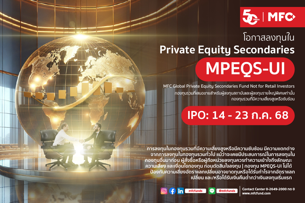 HoonSmart.com >> MFC เปิดตัวกองทุน “MPEQS-UI” เจาะตลาด  Private Equity Secondaries เพิ่มโอกาสสร้างผลตอบแทนระยะยาว บริหารโดยผู้จัดการกองทุนระดับโลก เสนอขาย IPO ระหว่าง 14-23 กรกฎาคม 2568 นี้