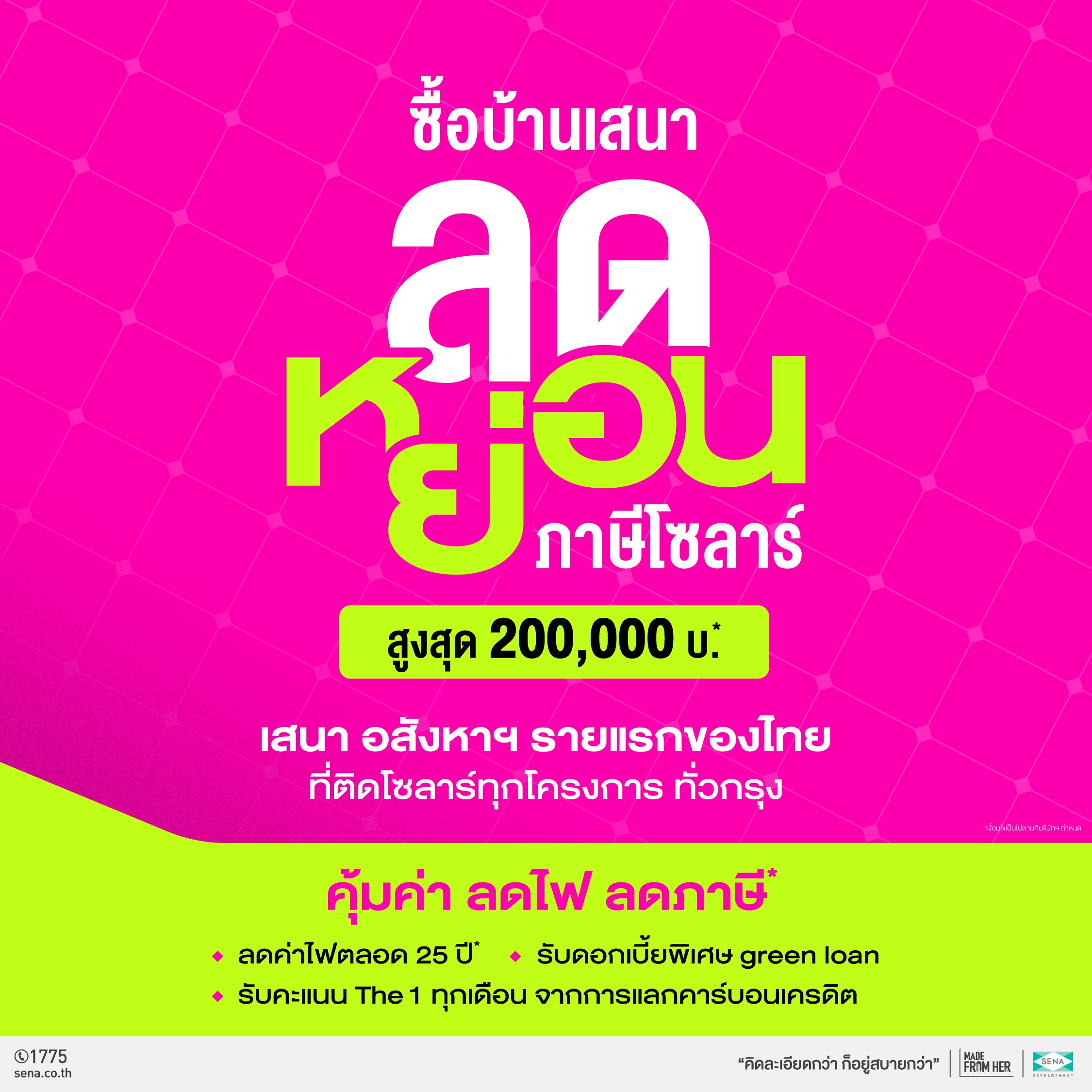 บ้านเสนา…คิดมาเพื่อคุณและโลก คุ้มค่า ประหยัดไฟ ลดภาษี มีแต่ได้กับได้ สนใจบ้านเสนาพร้อมบริการโซลาร์ครบวงจร ดูรายละเอียดเพิ่มเติมได้ที่ https://www.sena.co.th/sena-solar หรือ SENA Call Center โทร1775 และติดตามข่าวสารเสนาดีเวลลอปเม้นท์ ได้ที่ www.sena.co.th www.facebook.com/senadevelopmentpcl