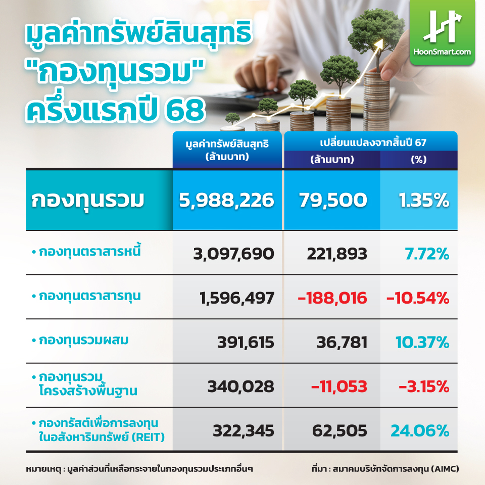 HoonSmart.com>> “กองทุนรวม” ครึ่งปีแรกปี 68 มูลค่าทรัพย์สินสุทธิแตะ 5.98 ล้านล้านบาท เติบโต 7.95 หมื่นล้านบาท หรือ 1.35% จากสิ้นปีก่อน นักลงทุนโยกเงินเข้ากองทุนตราสารหนี้หนุนโตต่อเนื่องมูลค่าทะลุ 3 ล้านล้านบาท ด้านกองทุนผสมเด่นมูลค่าเพิ่มขึ้น 10% หลังสงครามตะวันออกกลาง ภาษีทรัมป์ฉุดตลาดการลงทุนผันผวนทั่วโลก นักลงทุนกระจายลงทุนนอกผ่านกองทุน FIF โต มูลค่าเฉียด 1.4 ล้านล้านบาท ฟาก “บลจ.กสิกรไทย” มาร์เก็ตแชร์อันดับหนึ่ง เม็ดเงินบริหารจัดการมูลค่าเพิ่มขึ้น 8.3 หมื่นล้านบาท สูงกว่าอุตสาหกรรม